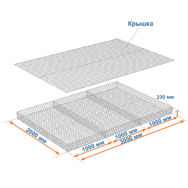 Габион матрац ГСИ-М 3х2х0,23 оцинкованный, Ø проволоки 2,7 мм, размер ячейки 8х10 см