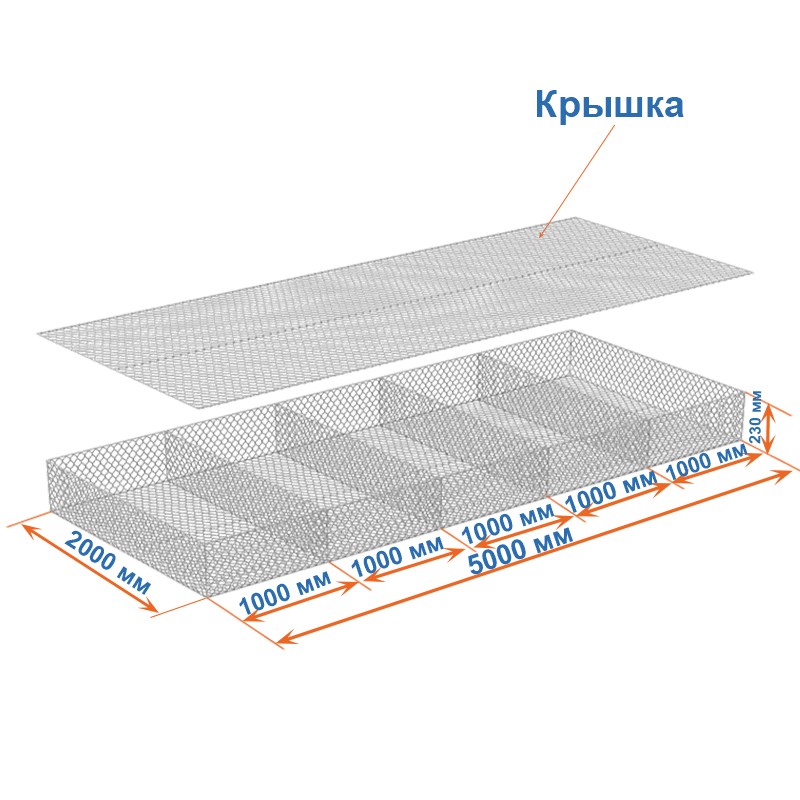 Габион матрац ГСИ-М 5х2х0,23 оцинкованный, Ø проволоки 2,4 мм, размер ячейки 6х8 см